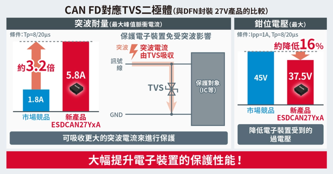 新產品透過優化元件結構,將引腳間電容*3降至最大3.5pF,可防止高速通訊時的訊號劣化。另外更實現出色的抗突波特性,大幅提高了車載環境中電子設備的保護性能。例如DFN1010封裝、可支援27V的新產品,與支援CAN FD的同等級市場競品相比,抗突波能力*4提高了約3.2倍,鉗位電壓*5也降低了約16%。可以有效保護車載ECU等昂貴且對突波敏感的電子設備,即使在嚴苛的車載環境中也能提供高可靠性。