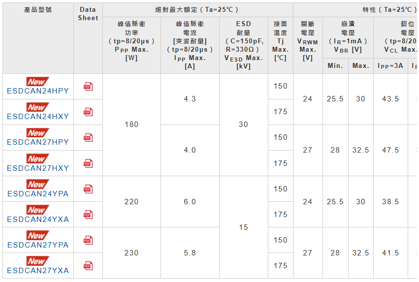「ESDCANxx系列」共有SOT-23(2.9mm×2.4mm)和DFN1010(1.0mm×1.0mm)二種封裝,分别支援24V和27V的關斷電壓(VRWM)。SOT-23封裝有支援24V的「ESDCAN24HPY」、「ESDCAN24HXY」和支援27V的「ESDCAN27HPY」、「ESDCAN27HXY」共4款,DFN1010封裝有支援24V的「ESDCAN24YPA」、「ESDCAN24YXA」和支援27V的「ESDCAN27YPA」、「ESDCAN27YXA」共4款,二種封裝共合計8款新產品。