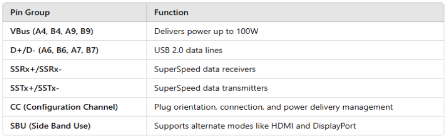 這些引腳使 USB Type-C 能夠提供高速資料傳輸、電力傳輸和多功能連接,所有這些都採用緊湊且可逆的設計。