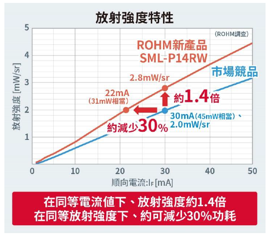 產品光源採用了ROHM自主生產製造優勢的技術,並且配備了對發光層結構進行優化的NIR元件。透過此技術,實現了在小型封裝中難以實現的業界頂級放射強度*4。例如「SML-P14RW」與同為1006尺寸的市場競品相比,在相同電流值條件下可實現約1.4倍的放射強度,而在相同放射強度下,功耗可以降低約30%。這不僅提高了感測精度,還可以降低應用設備整體功耗。