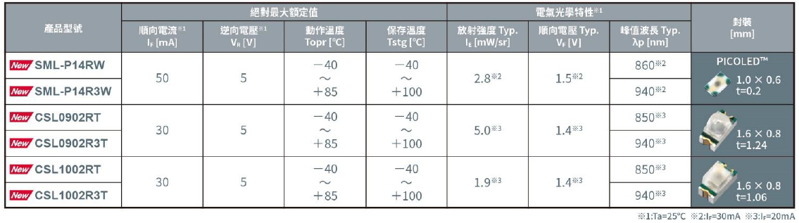 新產品共有3種封裝,6款型號。其中,超小型(1.0×0.6mm)且薄型(0.2mm)的PICOLED™系列*3有「SML-P14RW」和「SML-P14R3W」2款型號,而業界標準尺寸(1.6×0.8mm)系列,有窄指向角的圓透鏡型「CSL0902RT」和「CSL0902R3T」,以及寬照射範圍的平透鏡型「CSL1002RT」和「CSL1002R3T」共4款型號。上述每種封裝都有850nm(SML-P14RW為860nm)和940nm兩種波長,使用者可根據應用需求進行選擇。850nm波長與光電電晶體及相機感光元件之間的相容性極佳,適用於VR/AR眼球追蹤和物體偵測等追求高靈敏度的應用,而940nm波長不易受陽光影響,發光時不會呈現紅色,因此適用於人體感應感測器等應用。此外在脈搏血氧儀等生物感測應用中,還可運用於偵測血流量和血氧飽和度(SpO₂)。