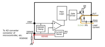 本產品具有電流監控功能,可將流經內部MOSFET的電流以固定比例折返並輸出至外部。透過從ISENSE腳位輸出與負載電流成正比的電流,並在外部安裝一個電流-電壓轉換電阻(RISENSE),可向微控制器輸出與負載電流相對應的電壓,從而更有效地控制直流有刷馬達。例如,微控制器可根據與負載相關的變化,將回授控制即時應用於H橋驅動器。