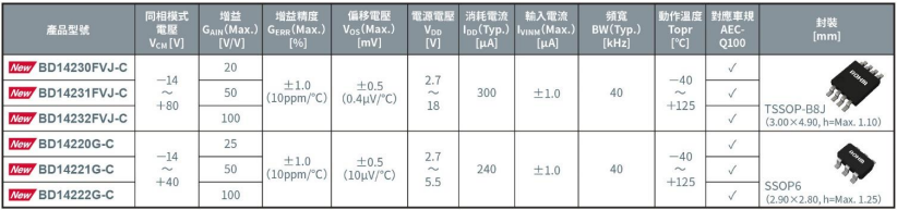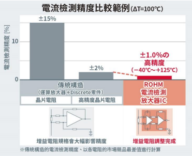 新產品將以往運算放大器結合Discrete元件的運算放大器電路組成進行一體化封裝,更加節省空間,透過連接分流電阻即可進行電流檢測。另外新產品採用二級放大器結構,輸入級採用了斬波放大器*3,後級則採用自穩零放大器*4,透過在IC內部匹配決定增益精度的電阻,不僅可抑制溫度變化的影響,還可實現±1%高精度且穩定的電流檢測。