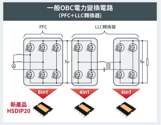- 透過改善電源電路中的輸入功率波形來提高功率因數的電路。使用PFC電路可使輸入功率接近正弦波(功率因數=1),從而提升功率轉換效率。PFC電路一般是採用二極體進行整流,但OBC有許多是使用 MOSFET來實現Active-bridge整流或是採用Bridgeless PFC。這是因為MOSFET的開關損耗更低,尤其是大功率PFC中,採用SiC MOSFET可以減少發熱和功率損耗。