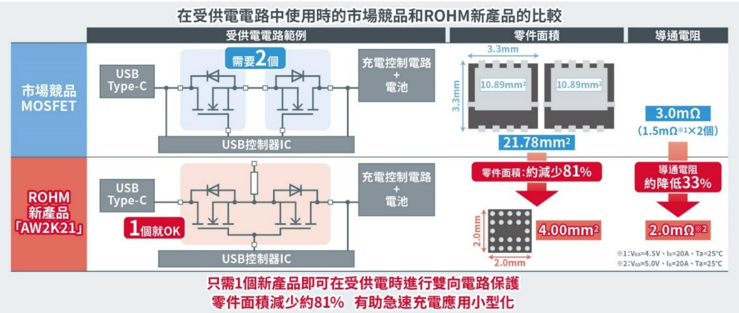 新產品中的ROHM獨家結構能夠將通常垂直溝槽MOS結構中,位於背面的汲極引腳置於元件表面,並採用了WLCSP*3封裝。WLCSP能夠增加元件內部晶片面積的比例,並降低新產品的單位面積導通電阻。導通電阻的降低不僅減少了功率損耗,更有助支援大電流,使新產品能夠以超小體積支援大功率快速充電。例如對小型設備的雙向供電電路進行比較後發現,使用市場競品時需要2顆3.3mm×3.3mm的產品,而使用新產品時僅需1顆2.0mm×2.0mm的產品,元件面積可減少約81%,導通電阻可降低約33%。即使與通常被認為導通電阻較低的同等尺寸GaN HEMT*4相比,新產品的導通電阻也降低了約50%。因此此款兼具低導通電阻和超小體積的「AW2K21」將非常有助降低應用產品的功耗並節省空間。