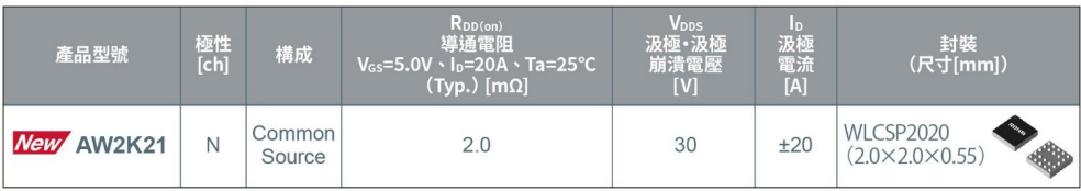 近年為縮短充電時間,智慧型手機等配備大容量電池的小型設備中,配備快速充電功能的產品日益增加。上述設備需要具備雙向保護功能,以防止在非供電狀態時電流反向流入週邊IC等元件。此外為了在快速充電時支援大電流,智慧型手機製造商對MOSFET有嚴格的規格要求,如最大電流為20A、擊穿電壓*5為28V至30V、導通電阻為5mΩ以下。然而一般MOSFET產品若要滿足此要求,需要使用2顆導通電阻較低的大體積MOSFET,導致安裝面積增加。為了解決上述問題,ROHM推出採用超小型封裝並具備低導通電阻的MOSFET「AW2K21」,非常適用於大功率快速充電應用。