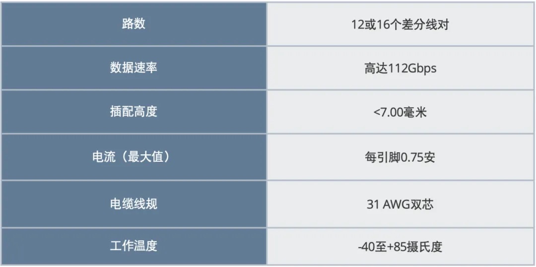 MicroBeam連接器和電纜組件專為高密度、近晶片應用場合設計,是扁平且高性能的連接解決方案。它們支持高達112Gbps的傳輸速率,具備卓越的信號完整性(SI),並提供12或16個差分對(DP)連接。其緊湊的設計使整體插配高度降至不到7.00毫米,從而減少了自身對其它組件的干擾,同時優化了空氣流動和熱管理。
