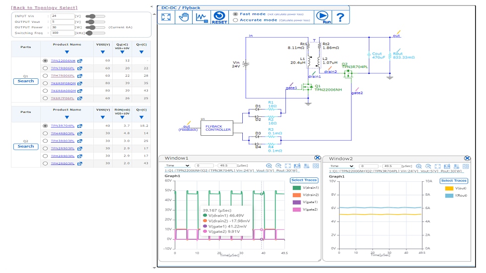 東芝線上電路模擬器是輔助選擇MOSFET的工具,可有效提升電源電路的效率。所有模擬均在線上完成,因此無需建立/設計模擬電路或取得任何元件模型。使用者介面設計直覺且易於使用,即使對於初學者也是如此。透過選擇拓撲並設定四個參數(輸入電壓、輸出電壓、輸出功率和開關頻率),將顯示基於設定值的建議 MOSFET 產品清單。選擇MOSFET並依需求調整電路參數後,即可執行模擬。