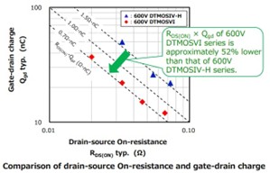 透過優化閘極設計和技術, DTMOS Ⅵ 600 V系列(包括新產品),與東芝傳統DTMOSIV-H系列產品相比,在相同VGS電壓,單位面積的導通電阻值降低了約13 %,導通電阻與閘-汲極電荷乘積的乘積(MOSFET性能的品質因數)降低了約52%。