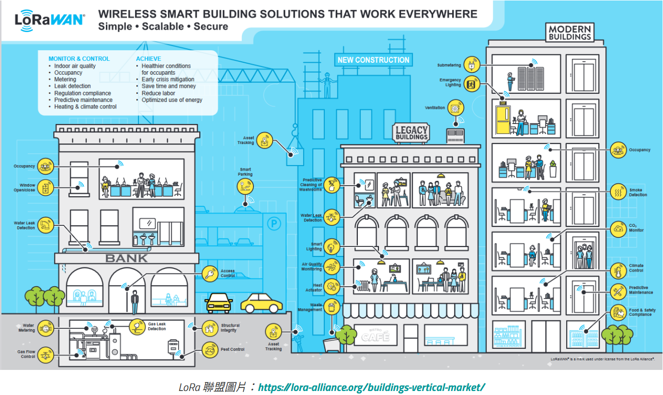LoRa® 聯盟已將LoRaWAN® 標準定位為智慧建築實施的重要技術。作為一種低功耗、遠距離無線通訊協議,LoRaWAN 標準為建築自動化提供了多項獨特優勢: