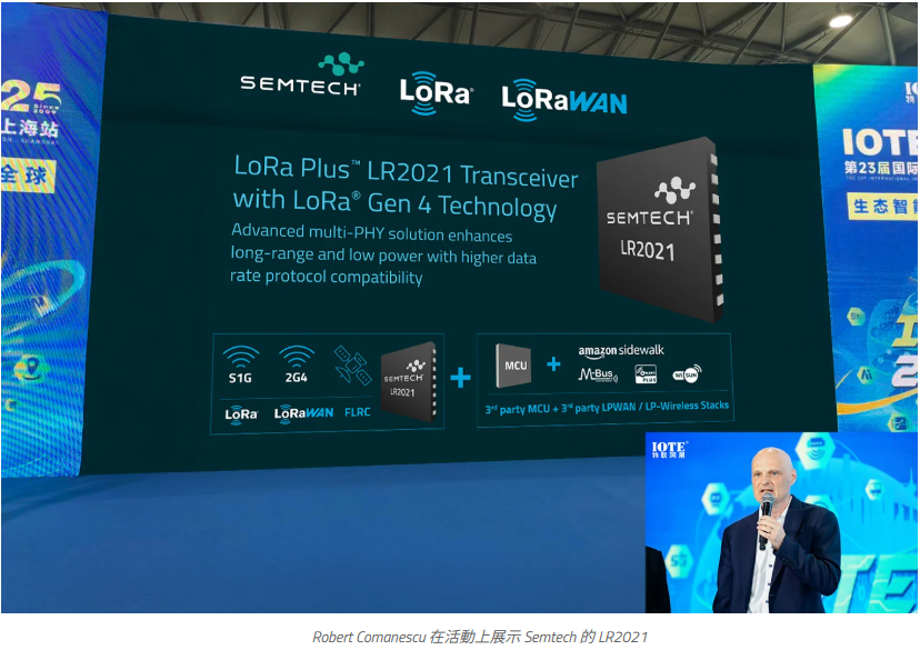 Comanescu也藉此機會展示了 Semtech 的第四代 LoRa 收發器 LoRa Plus™ LR2021和單通道集線器參考設計。 LR2021 支援 sub-GHz 和 2.4GHz 頻段,具有增強的靈敏度和多 PHY 功能。這些創新旨在支持從計量到安全系統等多個市場的高速、位置感知和節能應用。