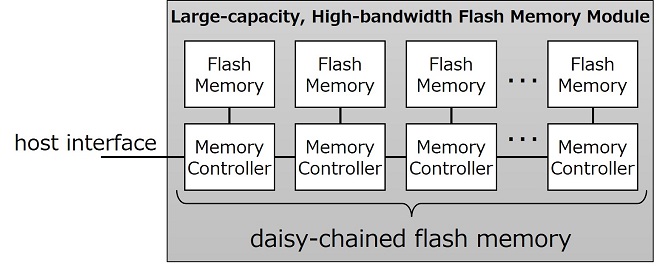 為了實現大容量和高頻寬記憶體模組,鎧俠採用菊鏈連接 (圖 2) 將多個控制器串接到每個記憶體板,取代匯流排連接。因此,即使快閃記憶體數量增加,頻寬也不會降低,並且可實現突破傳統限制的大容量。
