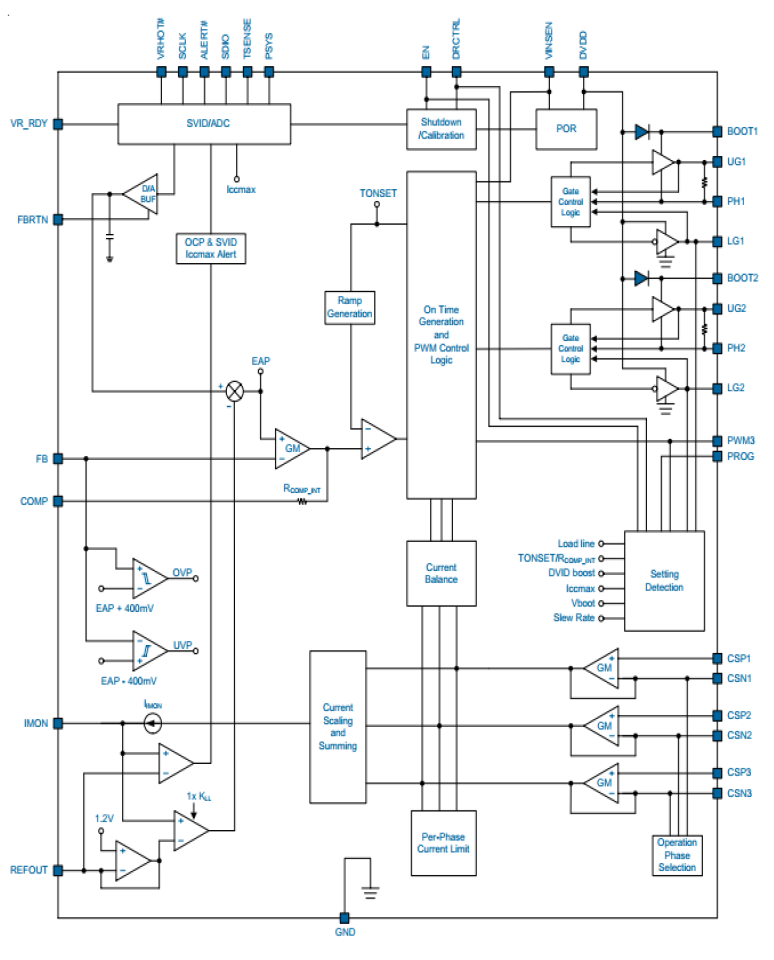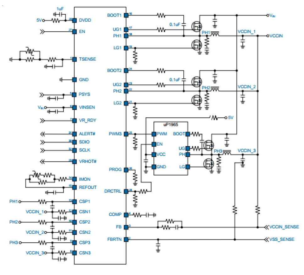 uP9523是一款兼容INTEL IMVP9的3相PWM穩壓控制器,適用於移動型電腦以及桌上型電腦平台應用。uP9523PQKI內建兩個5V MOSFET drivers與bootstrap diodes。此控制器支援3/2/1相位配置,為平台電源設計提供靈活性。此裝置同時結合了真實的differential output voltage sense, inductor DCR current sense, input voltage sense 與adaptive voltage positioning來提供CPU精準的調節電壓.