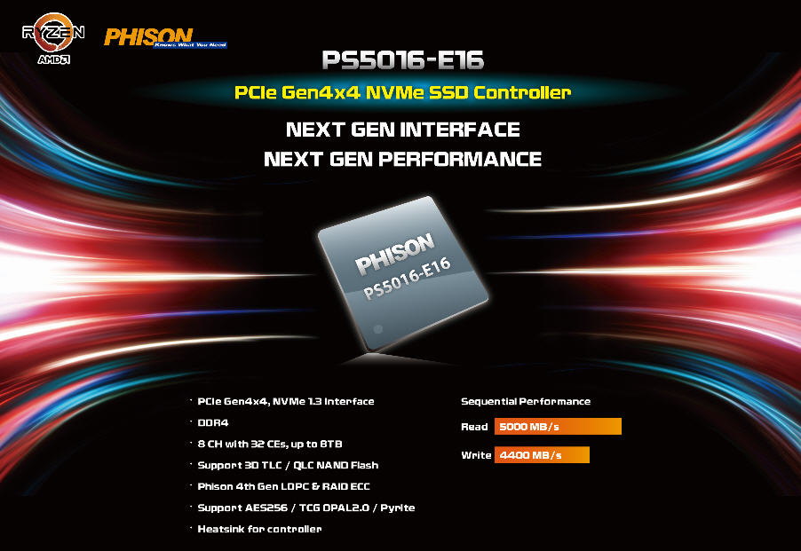 群聯的PS5016-E16控制晶片IC,是群聯目前的旗艦產品,也是消費應用市場上領先業界且唯一的PCIe Gen4x4 NVMe SSD控制晶片。採用28nm製程且搭載最新的96層 3D NAND快閃記憶體以及第四代的LDPC糾錯引擎,群聯PS5016-E16控制晶片最高效能達到5GB/s,透過獨家專利的硬體加速器設計,提供使用者前所未有的超高效能體驗,預計本季開始送樣及品牌客戶量產導入。