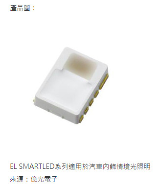 億光EL SMARTLED系列(3.0x4.1x0.9mm)將驅動IC整合至RGB LED封裝中,可以將元件校準色差控制在三階SDCM(亞當橢圓)內,透過內建IC程式可補償紅光晶片的光衰及自我診斷失效功能,傳輸速度可達到2Mbps。與傳統的RGB LED解決方案相比,EL SMARTLED提供更好的色彩均勻性且已通過國際AEC-Q102認證,廣泛的應用於車內環境光源、車頂閱讀燈照明及儀表板顯示照明等汽車內飾情境照明。