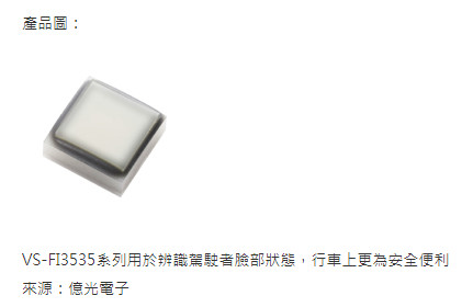 隨著全球資訊科技不斷演進,發展趨勢以智慧自動化創新研發為目標,行車時駕駛者的精神狀態十分重要,億光新款VS-FI3535系列可辨識駕駛者眼球及臉部表情,輕易地辨別凝視聚焦力、瞌睡或分心等狀況,VS-FI3535系列(2.8W, 3.5x3.5x1.6mm),發光角度110° x 85°,波長940 nm,波長受溫度影響約0.07nm/K,操作溫度-40°C~+105°C,Tr/Tf反應速度快,聚焦能力及效率有效提升,且通過國際車用AECQ-102認證,有別於一般LED及EEL元件常見的目標偵測發散及效率問題,億光VS-FI3535系列兼具品質與安全能力,可謂辨識駕駛者臉部應用的首選產品。