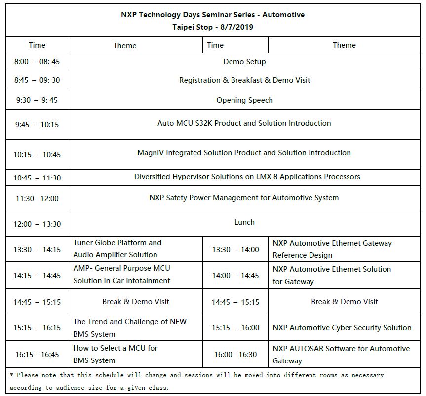 恩智浦技術日-專題研討會聚焦特定主題的資訊分享與技能構建,長度從一天到數天不等。這些區域性的活動採用課堂教學的形式,能夠拉近參會者與講師之間的距離,並通過小班授課方式提升教學品質。2019/8/7 恩智浦技術日汽車研討會台北場議程及報名資料如下,品佳集團技術專家亦會於場中展示車用相關方案,歡迎您前往參觀交流。