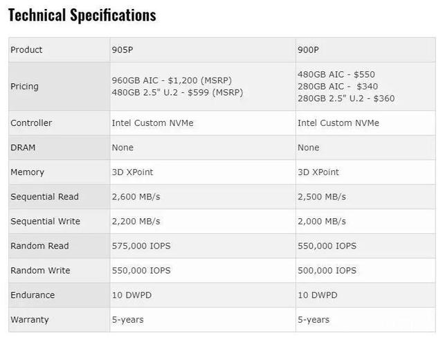 SSD 905P規格參數如下,目前有PCI-E和U.2兩種規格,容量分別為1.5T、960GB、480GB,都走PCI-E 3.0 x4系統通道,持續讀寫速度為2.6GB/s、2.2GB/s,隨機讀寫速度高達57.5萬IOPS、55萬IOPS,讀寫延遲僅10微秒,支持每天10次全盤寫入,壽命強悍,是此前SSD 900系列的升級版,總體表現較之900P有著5-10%左右的提升,並享受五年質保。