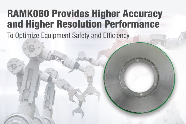 RAMK060採用轉子+定子的套件設計,以及離軸設計 (用於空心軸組裝),6.5 mm超薄尺寸和輕巧重量 (< 55 g),使其非常適用於空間小,但又需要高精度檢測角度位置的應用。RAMK060外徑60 mm,內徑25 mm。提供多種多圈型號,多圈型號帶有用於系統斷電時連接備用電源的連接器。輸出信號格式包括SPI、SSI或Biss-C。