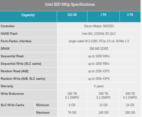 英特爾SSD 660p是一款PCIe 3.0 x4 SSD,採用M.2 2280單面外形。它通過NVMe 1.3協議與主機系統通信,重量僅為5.5g。性能上,512GB的連續讀寫分別是1500MB/s和1000MB/s,隨機速寫是90K和220K IOPS。1TB/2TB的連續讀寫都是1800MB/s,隨機讀寫1TB為150K、220K IOPS,2TB隨機讀寫都是220K IOPS。