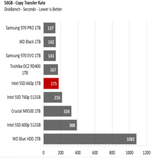 從系統引導到應用啟動,在4K讀寫方面的表現則好的出乎預料,這塊慧榮主控還是相當給力的。而在50GB的大文件複製測試中,Intel 660p只比最強的三星970 Pro少38秒,表現比之前的Intel 600P好多了。