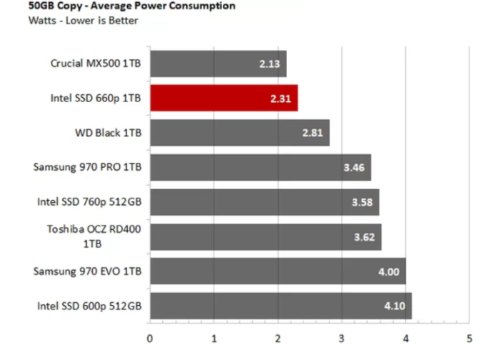 關於功耗方面,在測試評估中,功耗表現優於,只有2.31W,遠低於自家的600P、頂級三星970 Pro。低功耗產品的絕配。