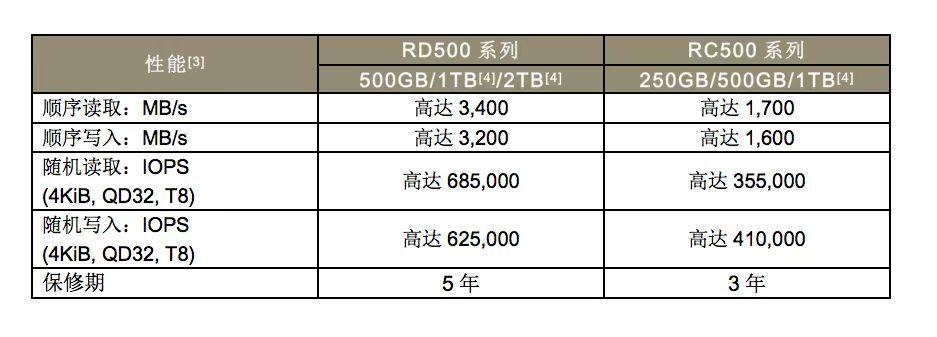 RC500系列採用4通道控制器,其開發之初即旨在提供比SATA更快的性能,非常適合於主流電腦需要更快解決方案的用戶。RC500系列單側模塊的容量高達1000GB/1TB,實現了一流的隨機性能[2]。