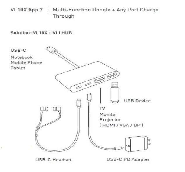 VL105可以執行DP-Alt mode視頻輸出功能,並在檢測到外部PD電源後同時為連接的主機充電。兩個下行的USB-C DRP 可以連接到USB-C PD電源供應器為主機充電,也可以連接到USB-C設備做數據傳輸。下行的DRP端口中的任何一個都可以按先插入先服務的原則為主機充電。VL105亦可以在DFP和UFP之間協商電源規則,然後選擇供電端,並支持PD 3.0快速切換供電規格。