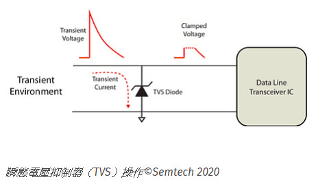 TVS二極管具有快速的響應時間和出色的箝位電壓特性,是保護系統數據接口的行之有效的解決方案。這些保護元件旨在將瞬態電壓箝位,並使瞬態電流與CMOS收發器電路隔離開。先進的TVS二極管具有非常低的箝位電壓和高浪湧抗擾度,且電容損失最小。與其他瞬態抑制技術不同,TVS二極管的性能不會隨著時間的推移而降低,並保持一致的箝位性能。