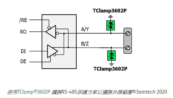 基於LoRa的網關還可以提供多個串行數據端口,其中最常用的是RS-232和RS-485。雖然乍一看,需要低電容可能看不到米為關鍵的,將RS-485鏈路可以有多個節點,因此它要考慮數據鏈路的總電容預算是非常重要的。通常,對於RS-232和RS-485,TVS元件需要承受更高的電壓(對於RS-232,通常為±15V;對於標準RS-485,則為+ 12 / -7V;對於擴展的共模範圍應用,則為+/- 36V)。 。下圖顯示了使用低電容TVS陣列保護擴展模式範圍RS-485鏈路的典型ESD和電湧保護方案。