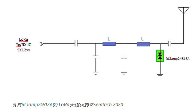 此外,基於LoRa的網關可提供具有不同RF協議的多個天線:Wi-Fi,NFC,GPS,4G,當然還有LoRaWAN。由於TVS是一種非線性元件,會並且會產生有害的諧波,因此不僅應將電容最小化(通常小於1pF),而且電容與工作電壓的關係也應盡可能穩定(不變)。通常,最好使用雙向TVS二極管配置對天線進行最好的保護,並在正極或負極上進行對稱箝位。下圖顯示了使用Semtech RClamp2451ZA器件在LoRa RF鏈路上進行ESD保護的示例。