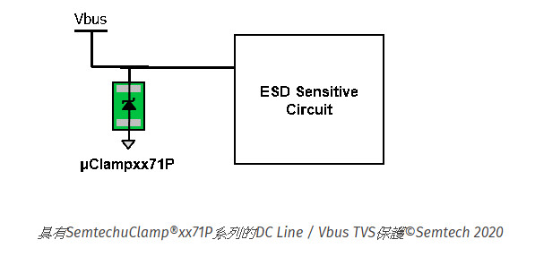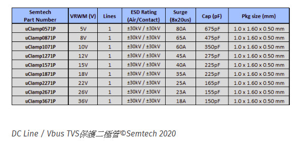 系統電源線和DC總線也存在過壓瞬變進入PCB的漏洞。像任何孔或系統開口一樣,重要的是要盡可能快地將攻擊者的瞬變抑制在系統入口附近。作為電源總線,這些線路可以承受額外的電容,因此通常可以使用具有更高Cj額定值的TVS。對於Vbus / DC線路,首選單向TVS設備。下表顯示了在不同電源總線電壓下的適當TVS保護解決方案。