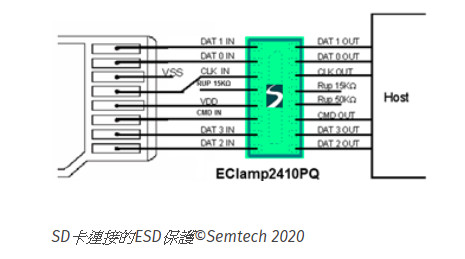 為了對網關進行軟件更新,系統有時可能會使用存儲卡。儘管很少觸摸存儲卡插槽,但裸露的引腳使接口在用戶操作時極易受到ESD電荷轉移的損壞。下圖說明了SD卡保護解決方案的典型示例。