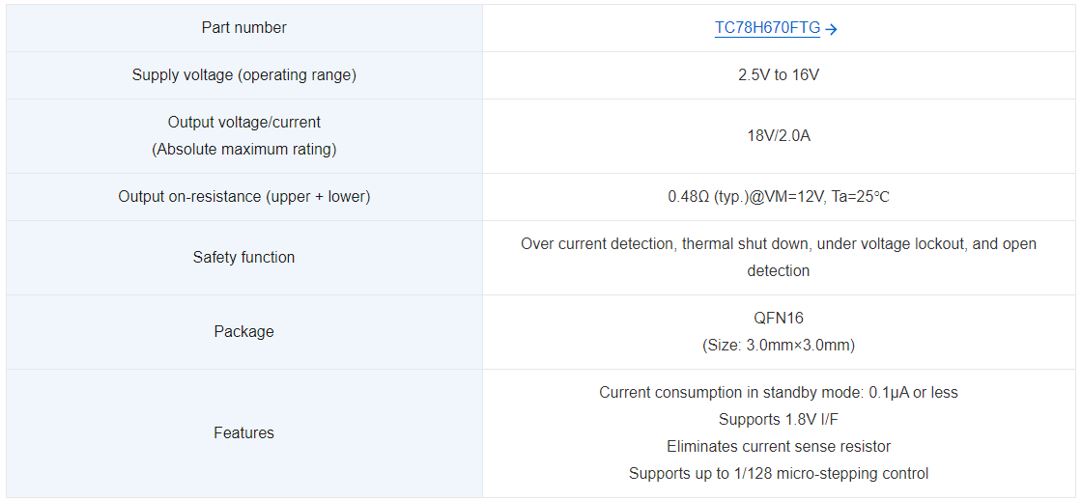 東芝電子元件及儲存裝置株式會社(東芝)推出最新微步進馬達驅動IC產品TC78H670FTG。這款IC最大額定值為18V/2.0A[1],可驅動各種工作電壓的馬達。已量產啟動。