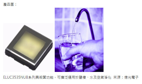 全球LED光電產業的龍頭製造廠,億光電子工業股份有限公司, 為維護國人生活品質環境衛生,於第一季推出新款UVC產品ELUC3535NUB系列,採用藍寶石基板特殊磊晶晶片及覆晶技術,保障品質功效,適用於殺菌相關應用。紫外線波長短、能量強,曝光照射下能引起化學反應和物質改變,經研究發展下,已普及於固化、醫療、光觸媒及驗鈔市場,在市場上需求成長快速,近年更有新興空氣殺菌淨化、靜止水殺菌與流動水殺菌應用,整體UV需求上大幅增加。億光深耕LED多年,擁有完整的UVA及UVC產品,UVA有2016、3535及4545三種尺寸供選擇,並有低中高瓦數及各式發光角度,客戶可依照自己需求做選擇。