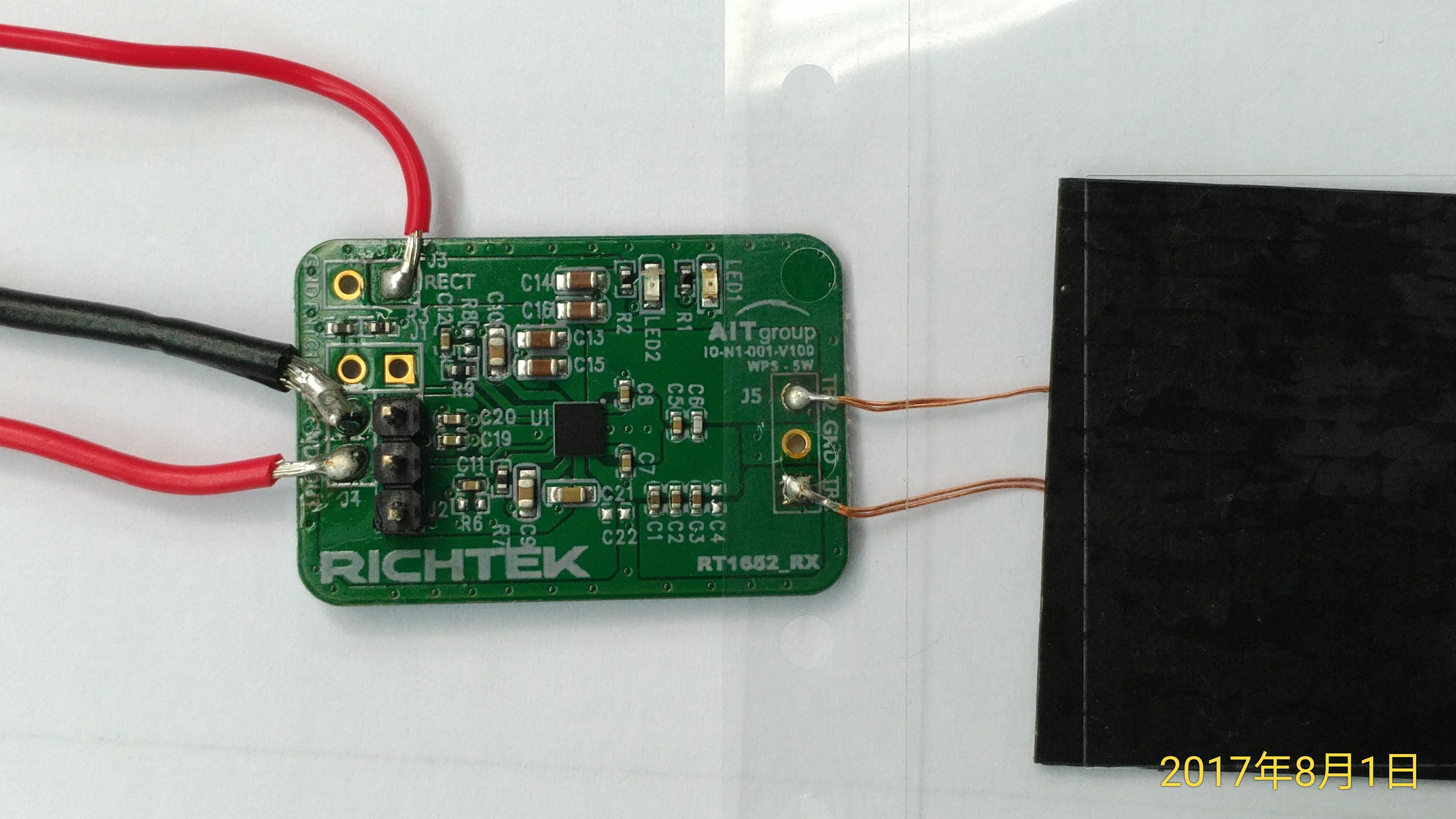 基於立錡RT1652無線充電IC來實現無線充電裝置(接收端)應用。RT1652符合WPC Low Power v1.2 及PMA v2.00 規範。輸出電壓 : 3V ~12V,支持整合同步整流開關,過電壓及過電流保護,並有IC溫度過熱保護。