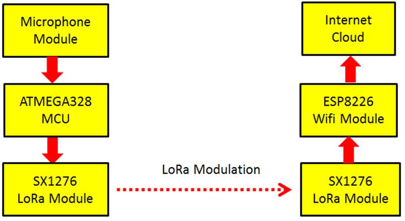 ① 感測器端 : 以單晶片接收由高感度電容式麥克風感測器送來的音訊信號後經OPAMP放大處理後再由UART送至LoRa模組發送至空中。 ② 資料接收端 : 由LoRa模組接收到資料後經UART把資料送至單晶片以判讀到有效數值後以UART介面經ESP8266W Wifi 模組送至Internet。 ③ 網路端 : 把由單晶片送來的API、Sensor ID、Device ID及Co Data送至雲端服務紀錄資料。 ④ 用戶端 : 使用者以電腦或是手機隨時可以上網檢查數據。