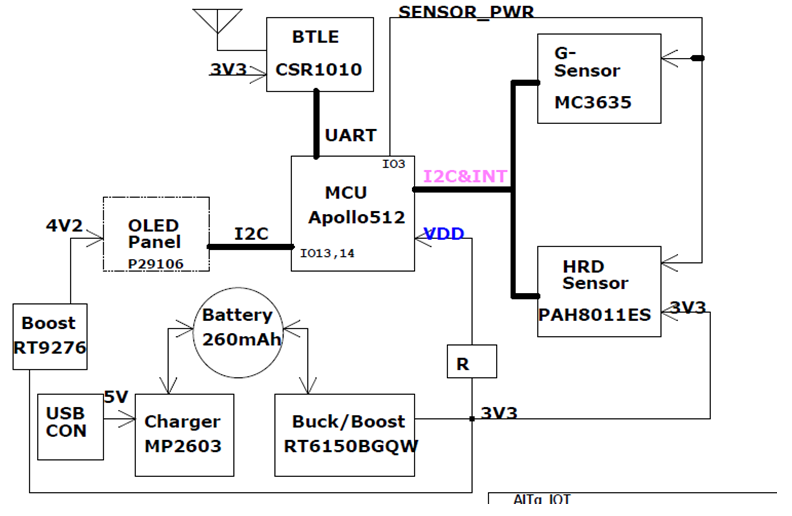 詮鼎公司整合Pixar PAH8011ES心跳量測 ,CSR10xx藍牙晶片,mCube G-sensor加上低功耗Ambiq512 MCU ,使其製造商便能夠為消費者提供更低耗能的心跳量測裝置.可單機操作或透過藍牙由手機編輯功能: