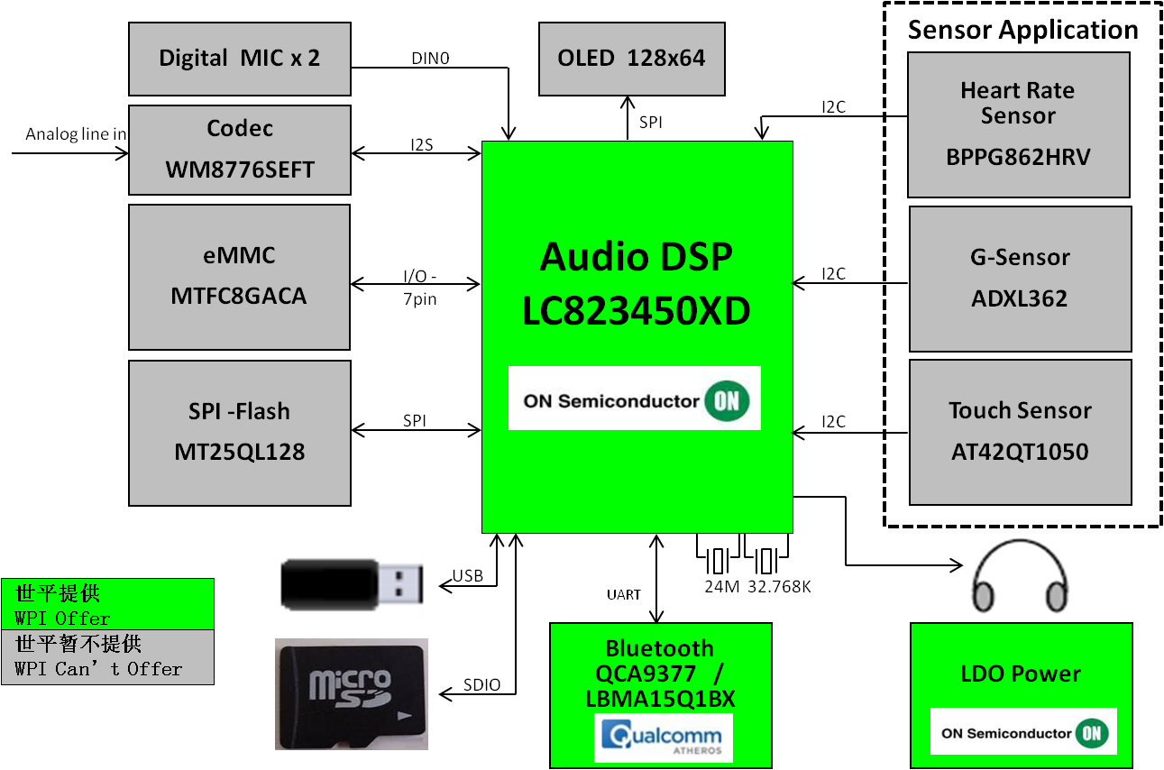 因此, 世平集团推出基于 ON Semiconductor LC823450XD 的无线蓝牙耳机参考方案,可实现音频播放,录音等功能, 除此之外,还可以通过蓝牙与手机通讯,上报计步和心率数据。ON Semiconductor LC823450 是音频处理系统大规模集成电路 (LSI),为其供电的是高能效的 ARM® Cortex®-M3 核和 32位/192 kHz 音频处理引擎,支持基于硬件的 MP3 编码/解码和无线音频,提升性能和电源能效。LC823450 以其充足的片上 SRAM (1656k字节),为音频处理和应用任务提供大量内存,无需配备辅助内存芯片。设计人员还可利用丰富的集成的音频外围器件如模拟/数字转换器、锁相环和 D 类放大器。此外,行业标准接口如 SPI、I2C、SDCard 和 UART 使产品设计人员能内置通用连接。