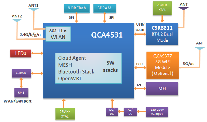QCA4531是一款低成本的Turnkey方案,可讓在開發者在Linux / OpenWRT環境中客製化功能。受益於基於2x2 11n的擴展範圍,QCA4531可設計為作為智慧家庭中的IoT Gateway,並且支援Bluetooth MESH技術連接IoT裝置,另外提供CLOUD雲端服務,讓使用者可以透過手機APPf遠端監控IoT裝置