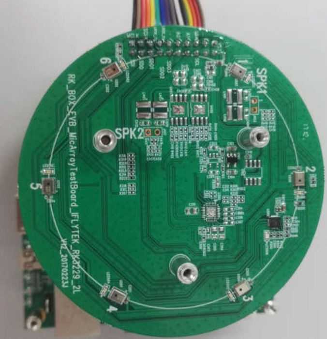 1. 圓周陣列麥也可設計用來做語音喚醒功能,因此不需要單獨的喚醒麥。 2. 6+0+2麥克風陣列的含義是: 3. 6個圓周麥克風、 4. 0個喚醒麥、 5. 2路回採音訊信號。 6. 6個MEMS數位麥克風以順時針方向均勻分佈在直徑70mm的圓周上