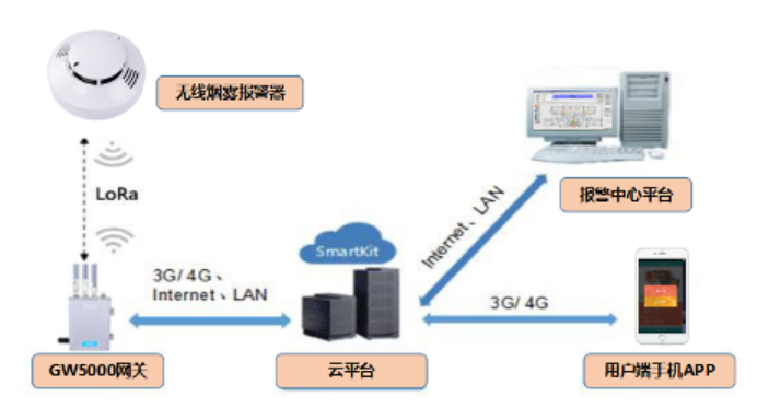 ★無線煙霧報警器 採用紅外散射原理來探測煙霧,當煙霧達到預定閾值時,發送報警資料到網關,並且發出報警提示聲。 ★LoRa網關 提供 LoRaWAN服務-接收前端設備的通信資料,在無線煙霧報警器和雲平臺之間中繼資料傳輸。與雲平臺可通過乙太網、GPRS、3/4G網連接。 ★ 雲平臺 收集通過網關傳輸的資料資訊。並將資料資訊傳送到後臺應用軟體處理。雲平臺還提供歷史事件資料記錄、資料加解密、資料包糾錯、資料備份存儲服務。 ★報警中心平臺 自動記錄報警時間、報警單位資訊、位址、連絡人等基本資訊,以後管理人員應急處理。 ★ APP手機用戶端 通過互聯網接收雲平臺推送的資訊,實現人機交互和對前端設備的管理。