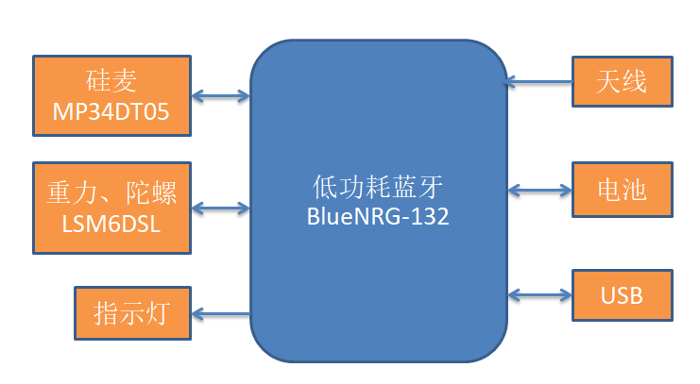 1、 Bluenrg-132軟體發展包自帶有語音編碼庫。 2、 MP34DT05直接PDM輸出到Bluenrg-132。 3、 外加LSM6DSL(重力加陀螺)6軸感測器,可以比較容易進行動作識別。