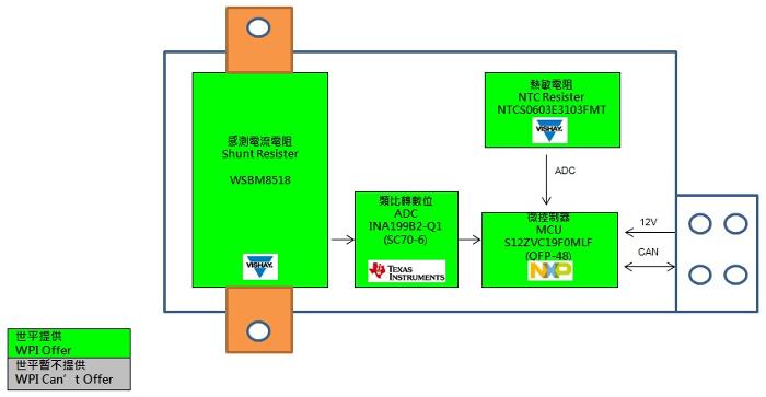 世平率先提供基於 NXP S12ZVC 的車用大電流監測器 ( Current Detector ) 方案,結合 Vishay 大電流金屬檢測電阻並加上演算法,讀取出正確且穩定的充放電電流值;除此之外還提供現場溫度,CAN Bus 輸出及 Molex CAN bus Cable,讓使用者或是廠商簡單快速的將世平車用大電流檢測器接入至車載系統,透過車載系統可以即時的得到目前電流與溫度變化、進而提醒車主。
