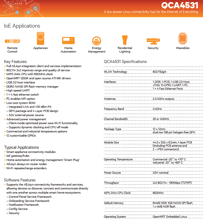 QCA4531是一款低成本的交鑰匙式解決方案,帶來高性能的連接方式,能夠提供一個使用者可程式設計的Linux/OpenWRT環境,從而使用戶從基於2x2 11n擴展的範圍中受益。借助Linux構架,該方案可作為功能豐富的萬物互聯節點,也可以作為樞紐(hub)實現萬物互聯生態系統。隨著萬物互聯生態系統的發展,QCA4531的出現將成為多協定橋接和通訊的理想選擇,可橋接多種無線媒介與不同的生態系統。它可以作為接入點(AP),支援最多16部終端同時運行;