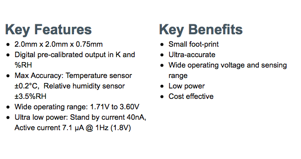 Benefits Features • Ultra-accurate • Temperature sensor (±0.2°C) • Relative humidity sensor (±3.5%RH) • Wide sensing range • Temperature operating range (–40°C to 100°C) • Relative humidity operating range (0% to 100%) • Wide operating voltage • 1.71V to 3.60V • Small foot-print • 2.0mm x 2.0mm x 0.75mm • Industry standard two-wire interface • Standard (100kbit/s) and fast (400kbit/s) I²C • Low power • Automatic low-power standby when not measuring • Active current: 7.1μA @ 1Hz (1.8V) • Standby current: 40nA • Cost effective • Digital pre-calibrated relative humidity and temperature sensor • Output directly in %RH and Kelvin • Wide supply voltage range • High reliability • Long-term stability