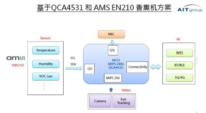 QCA4531作主控,通過增加各類型的感測器即時監測環境資料,以實現動態調節。如增加AMS的ENS210感測器可以即時得到環境的溫度與濕度資料以決定是否打開/關閉智慧香熏機及調節噴霧的大小,還有增加水位的監測,防止燒幹和提醒加水。如果要擴展應用的話,還可以增加麥克風和攝像頭用以監控家裡的安全。