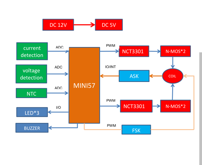 新唐無線充電方案符合無線充電聯盟 (WPC) Qi 標準,主控晶片 Mini57 採用 32 位的 ARM® Cortex®-M0 為內核,內嵌豐富外設資源,可靈活增添功能,具備高性能、低功耗的優點。本方案實現 Qi 標準的所有功能,相容符合 Qi 標準的接收器,並具智慧管理無線電源傳輸。為了提高使用者體驗的滿意度,增加動態功率調整功能,當輸入功率不足時,也能保證充電。同時,還添加了金屬異物檢測功能,確保充電過程安全。本方案採用 5V 供電,適用於無線充電發射端,主控晶片 Mini57 通過解碼接收端發送的信號,調整脈寬調製信號(PWM)的頻率,控制諧振電路之頻率改變充電電流,從而滿足發射端的要求。Mini55 主控晶片運行頻率可達 48Mhz ,內建 3 個 16 位元脈寬調製發生器,提供 6 路脈寬調製輸出或 3 對互補的脈寬調製輸出,10 位元類比數位轉換器,轉換速率達 500KSPS 。NTC3703 是 V3.3 穩壓器晶片,提供誤差不大於 2% 的參考電壓,大幅提升類比數位轉換器檢測的精度。