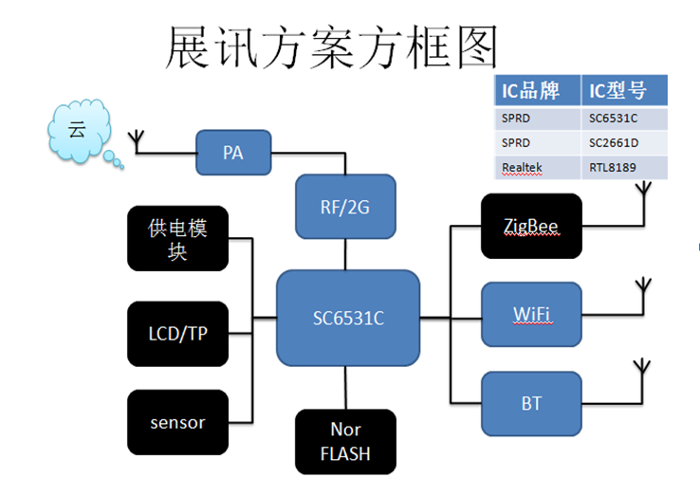 客戶使用展訊SC6531CA研發了一款智慧家居中控平臺,可以通過WiFi,BT,ZigBee等無線通訊控制各類傢俱產品,也能通過讀取溫度,濕度,氣體等感測器實現環境監測,使用2G/WiFi網路經過雲端實現遠端手機或者電腦操控以及監測。