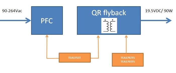 NXP推出TEA1755T PFC+QR Flyback架構,搭配同步整流技術IC TEA1792TS,將整提效率提升之外,更搭配節能IC TEA1703TS,使空載能耗遠低於法規要求。